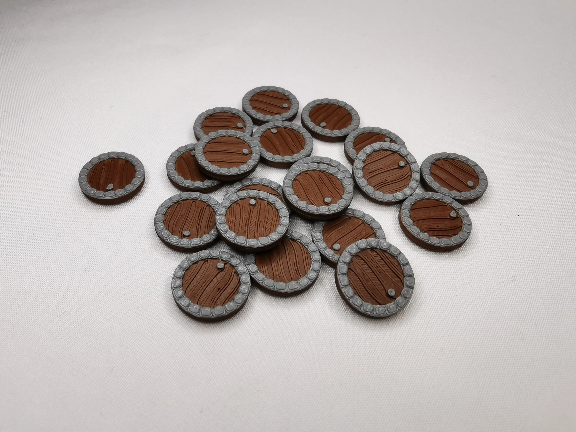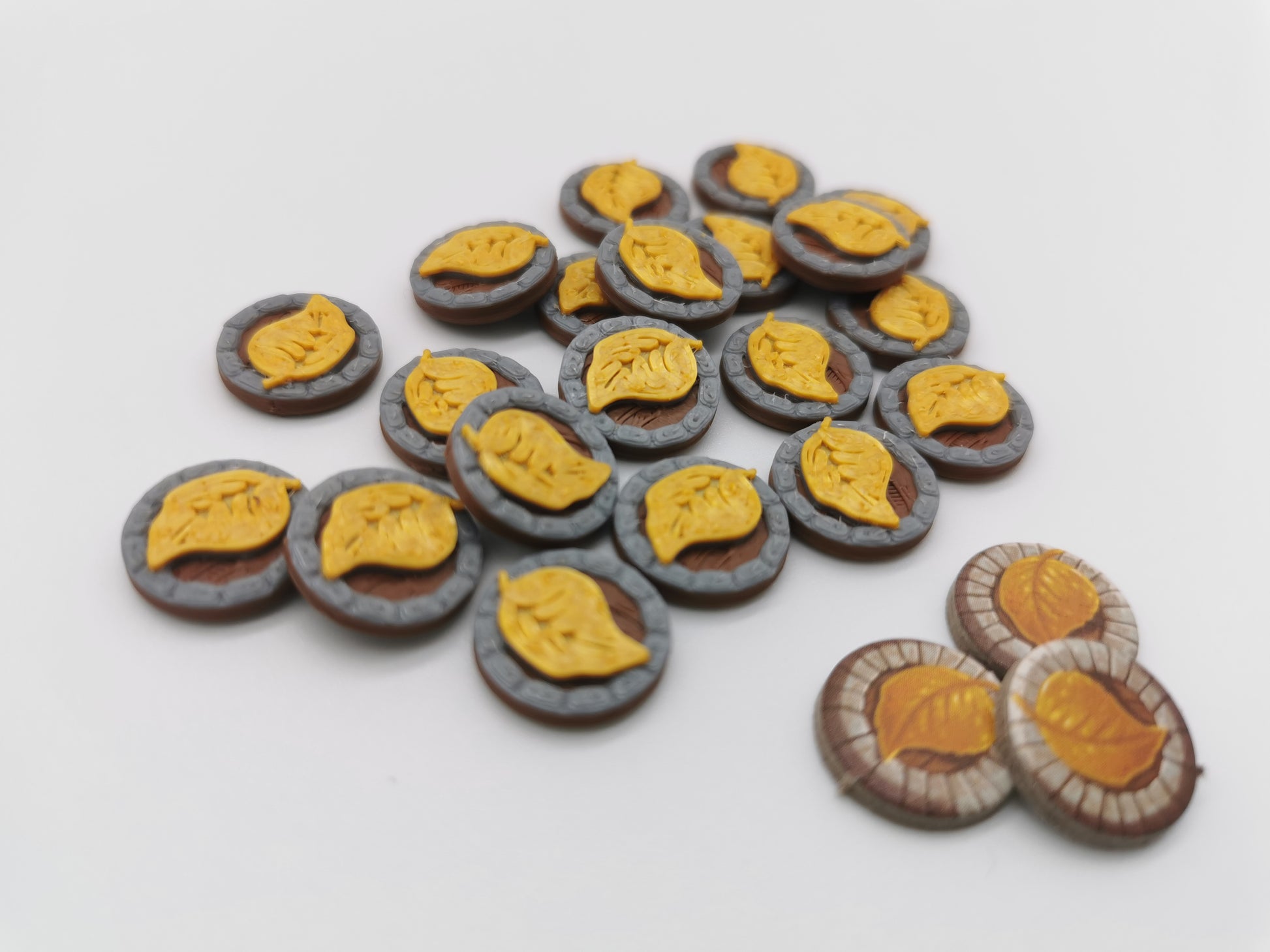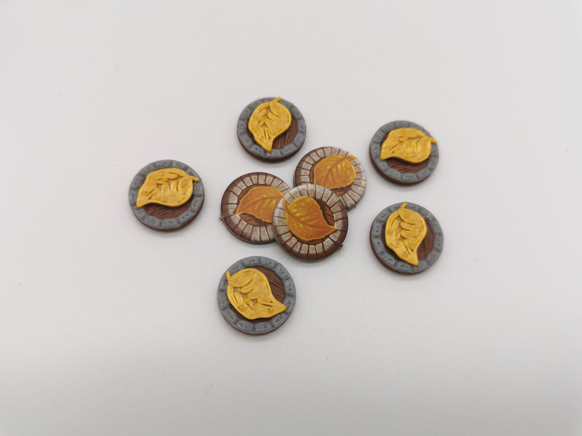 Je nach gewählter Ausführung 20 Stück Besetzt-Marker für Grundspiel oder 20 Stück Goldene Besetzt-Marker für Erweiterung "Newleaf" mit oder ohne Eichel-Schale.