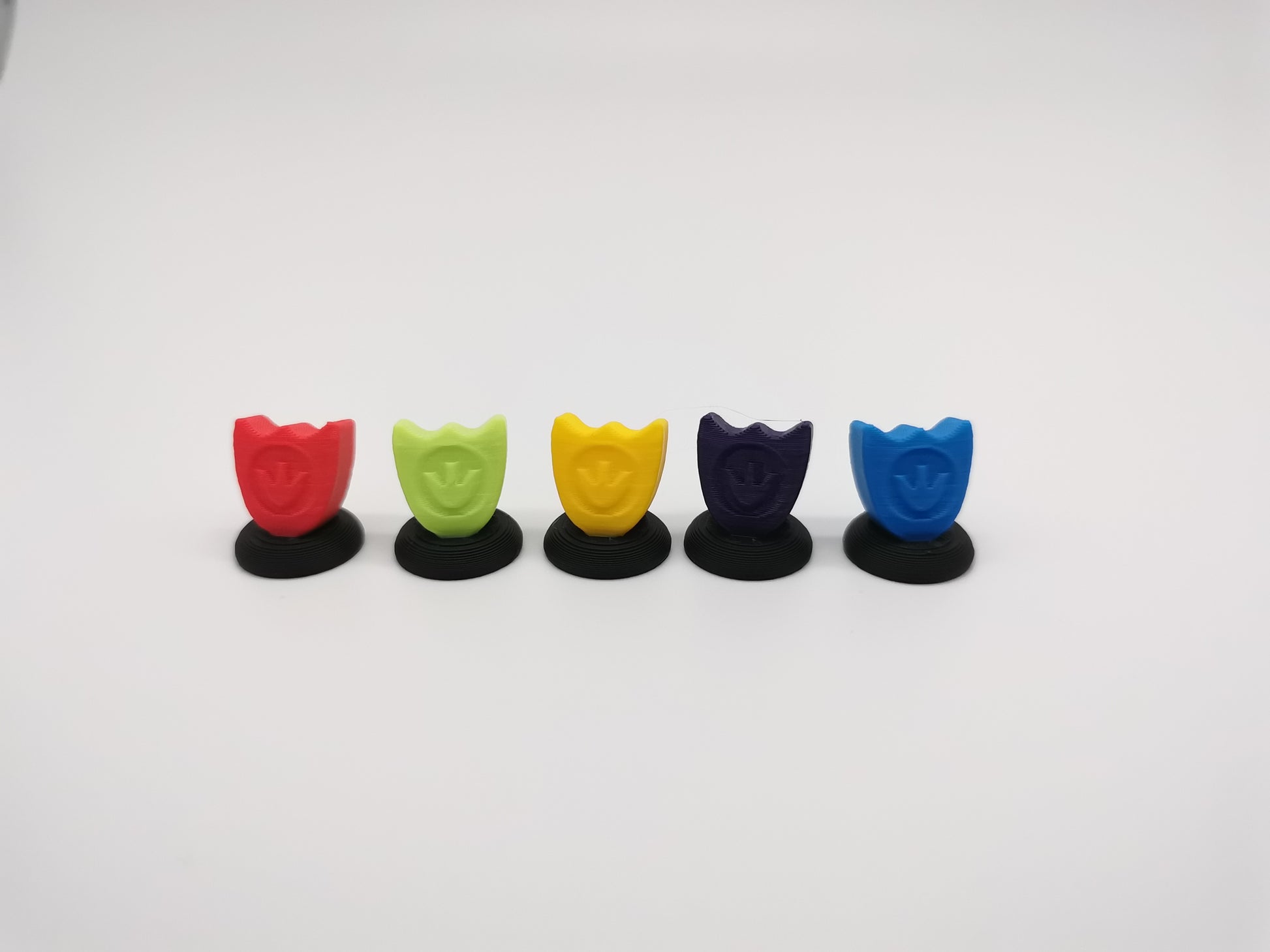 je 1 Gildenmarker in blau, apfelgrün, rot, dunklem lila und gelb - jeweils mit schwarzem Sockel.
