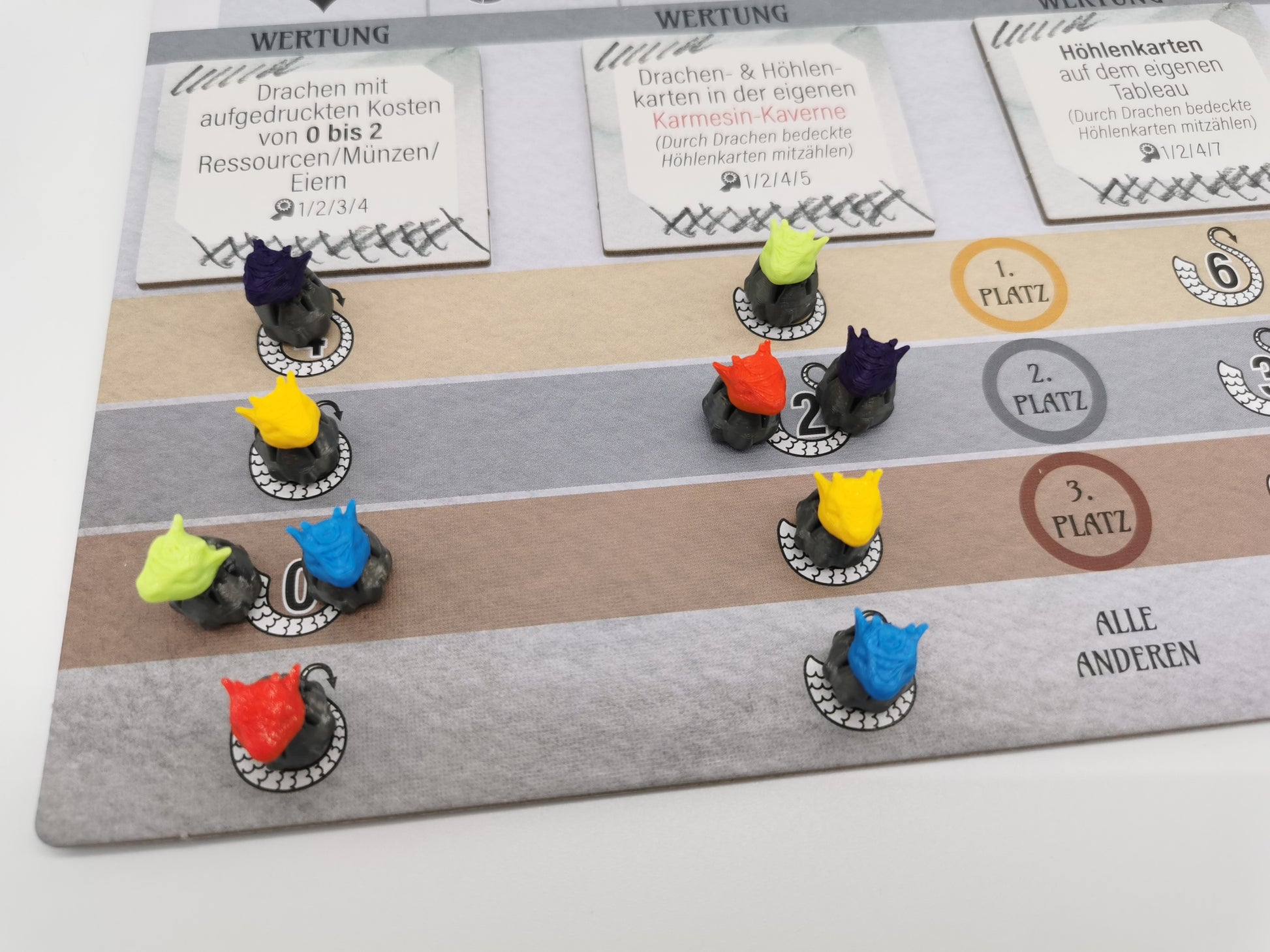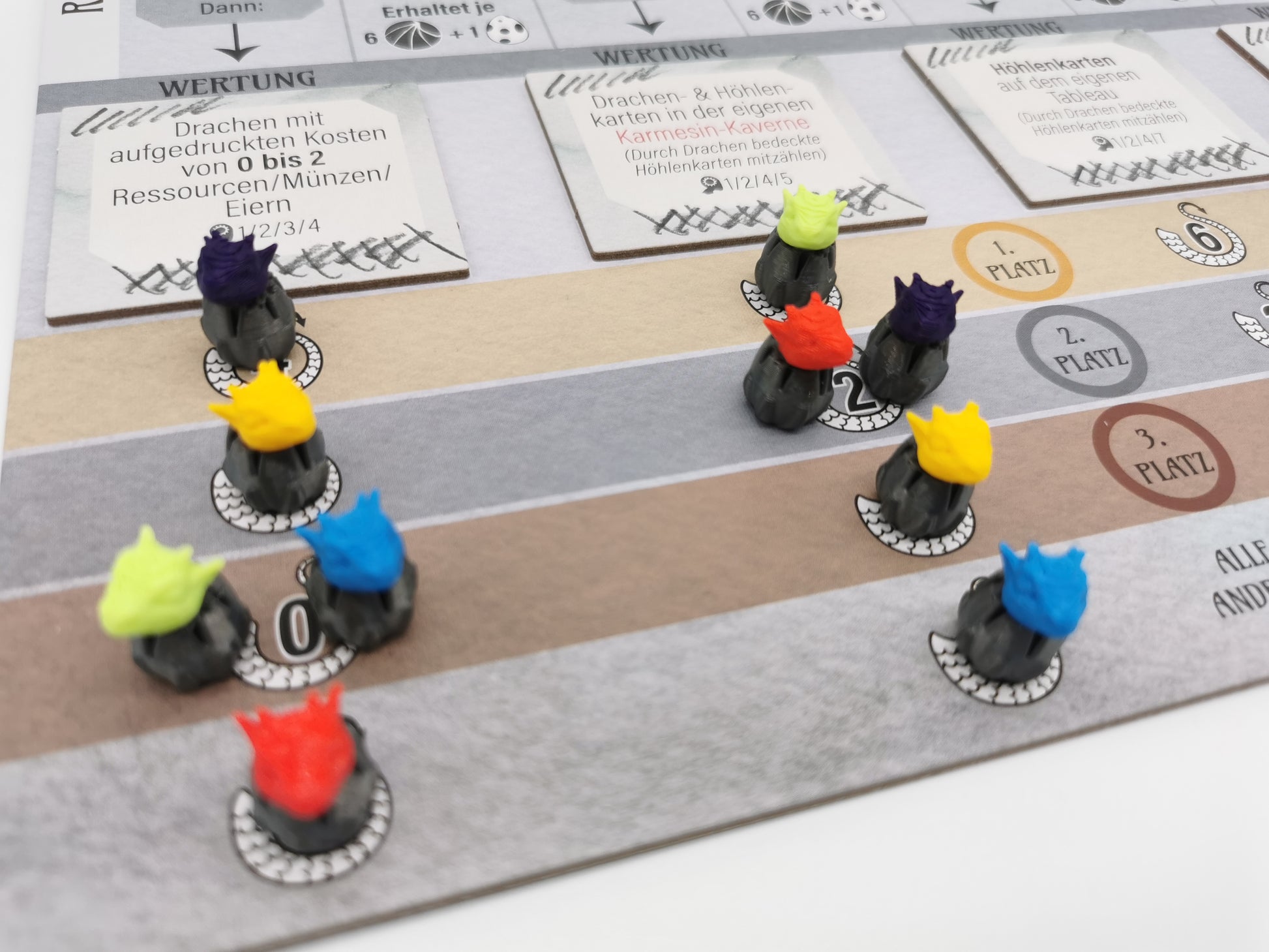 Natürlich kann man die kleinen Holzwürfel des originalen Lieferumfangs nutzen und mit ihnen auf der Wertungstafel und der Gildentafel die Punkte anzeigen. Mit diesen kleinen Spielsteinen sieht das aber so viel schöner aus und zaubert dir ein Lächeln aufs Gesicht, wenn du deinen 'Cube' auf das Spielbrett setzt.