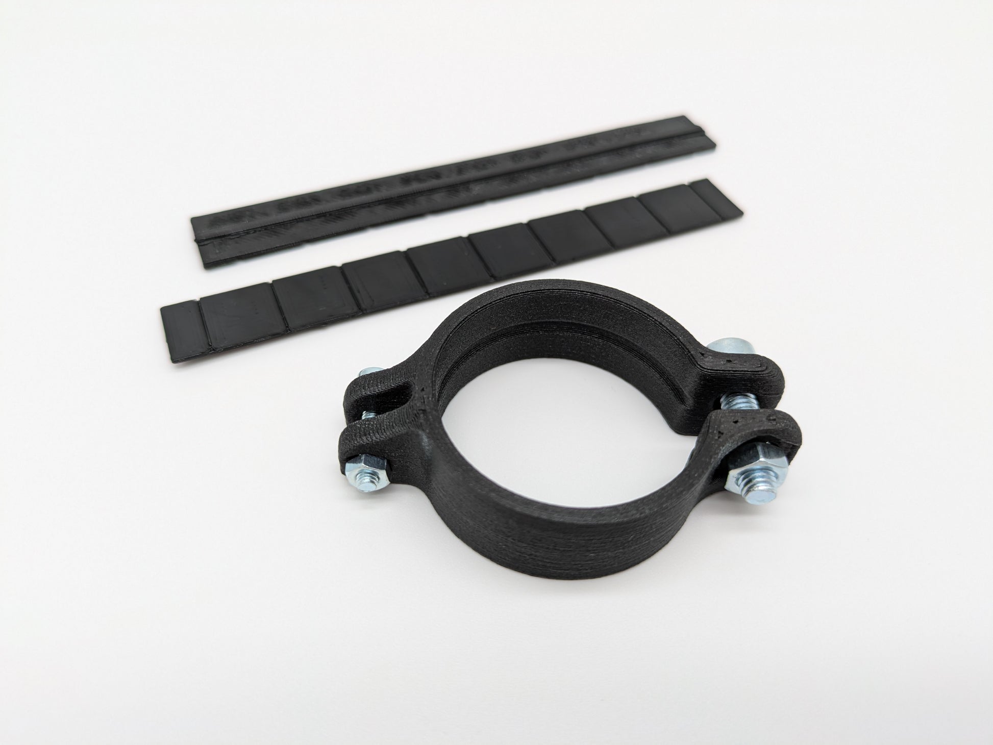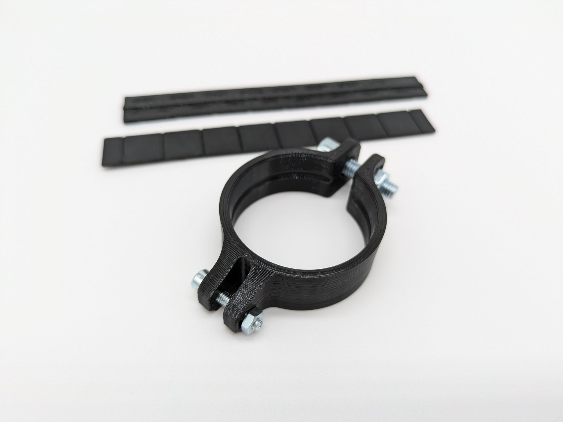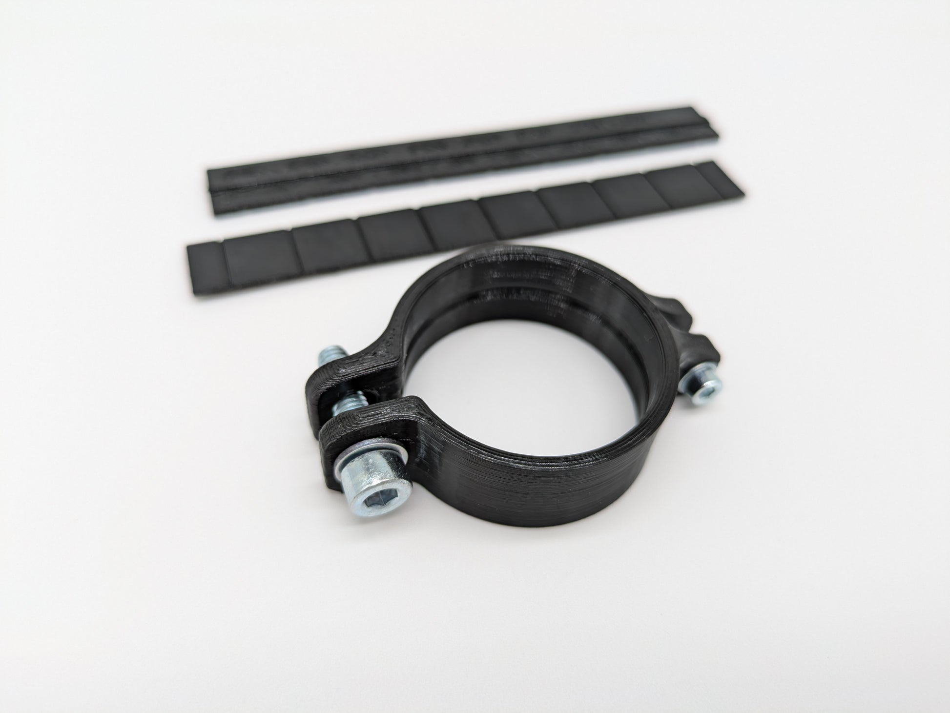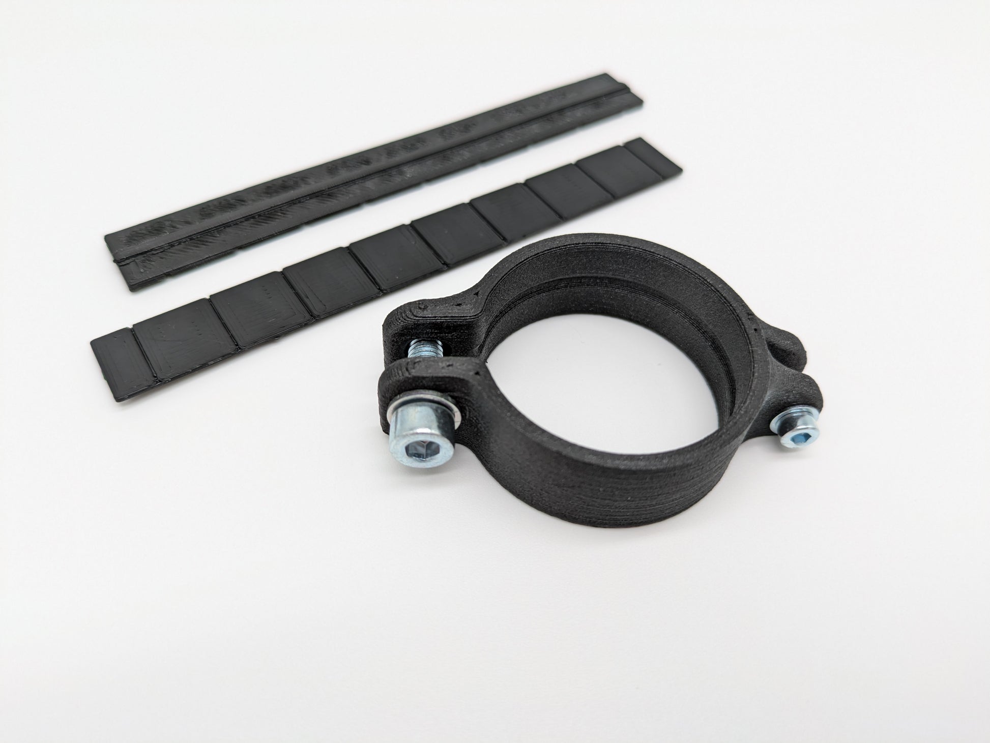 Diese breite Ausführung ist optisch gut geeignet um sie zum Beispiel an einem Mountainbike zu verwenden. Durch die verschieden dicken Reduziereinlagen aus flexiblem und rutschhemmendem TPU passt die Klemme an Sattelstützen mit einem Durchmesser von 30,5mm bis 35,5mm. Die Einlage wird durch eine Fase in der Halterungsschelle vor dem Verrutschen gesichert.
