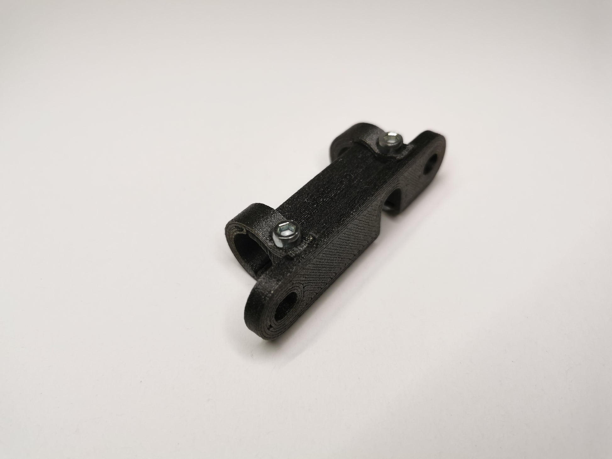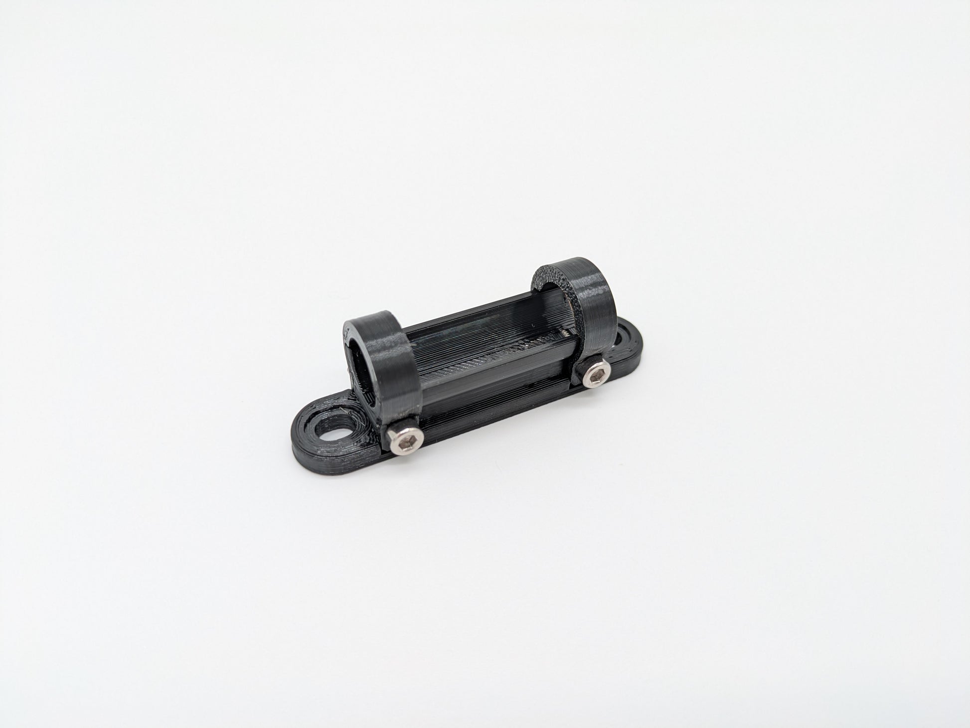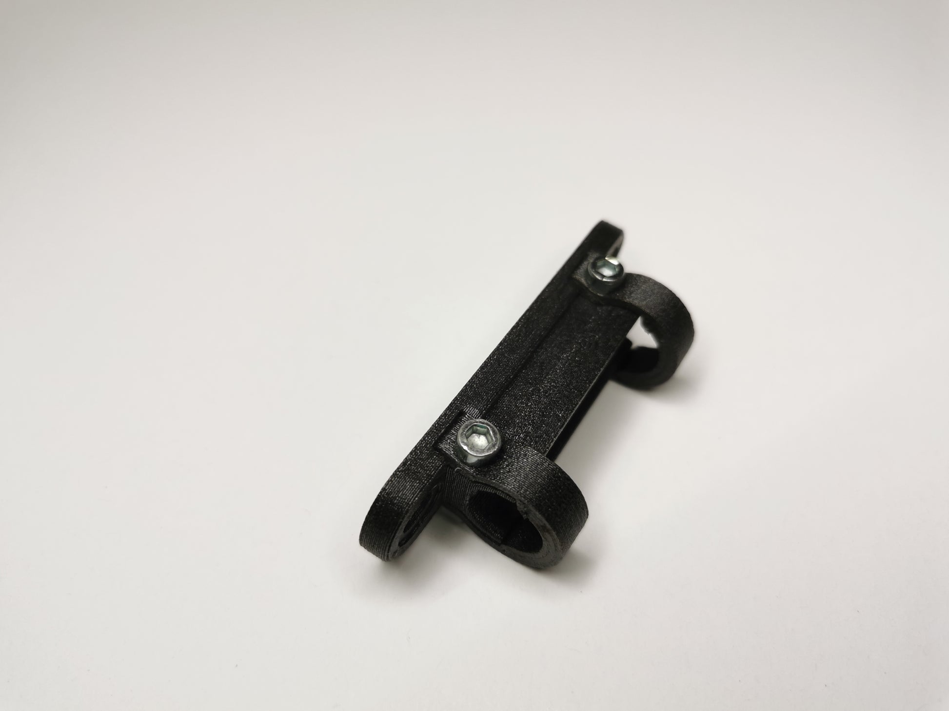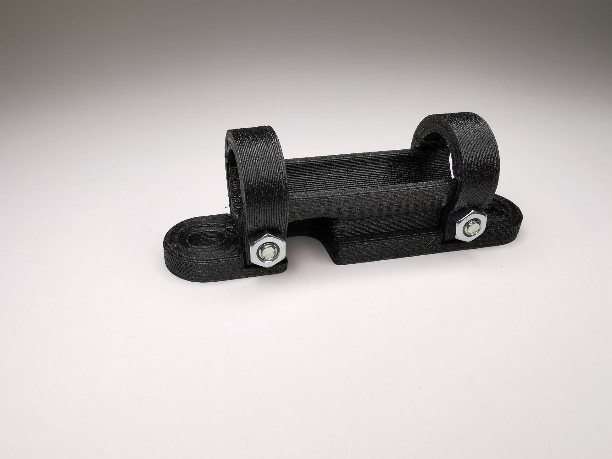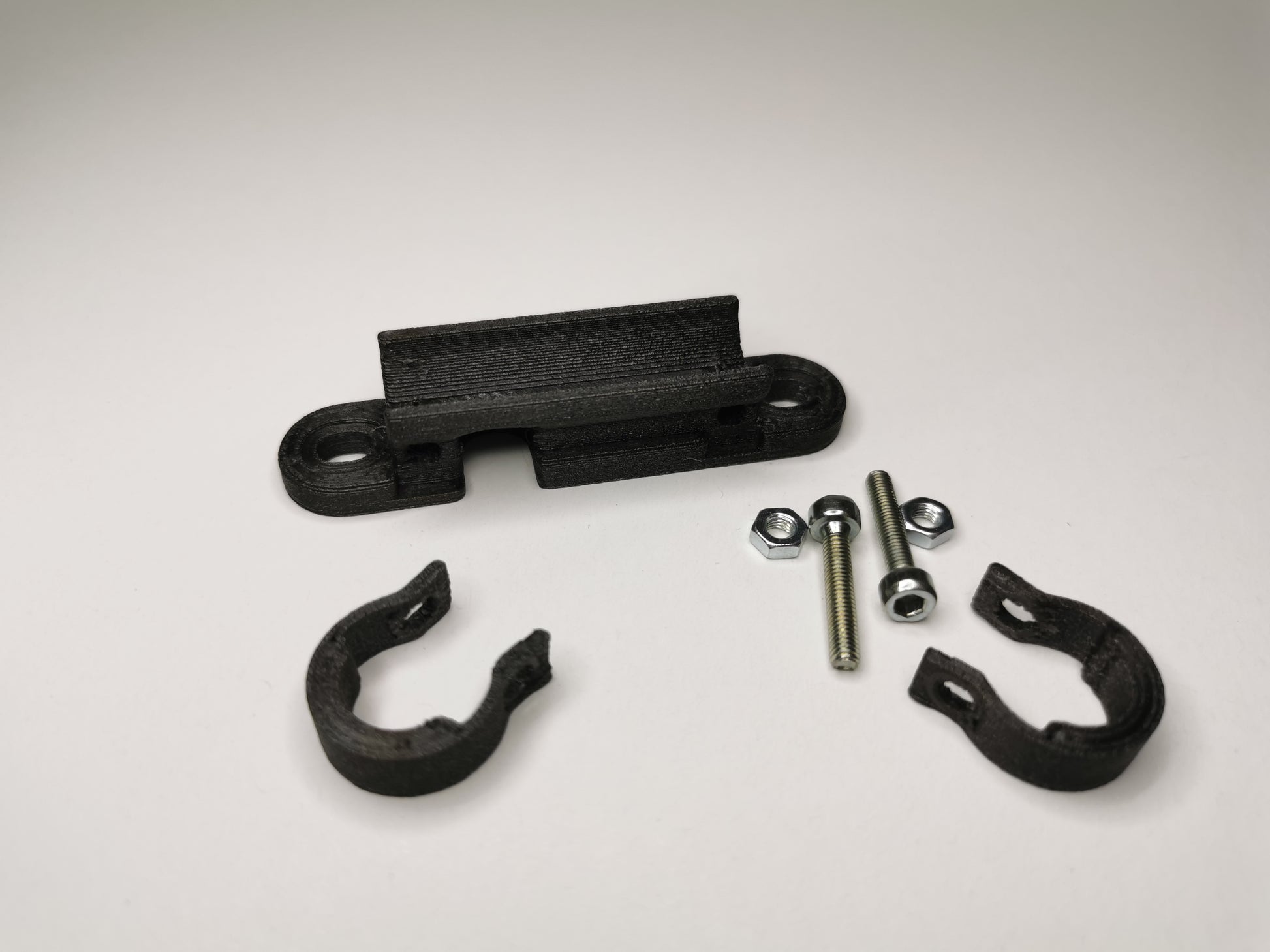 1 schwarze Rücklichthalterung zur Montage an Gepäckträgerstreben mit 10mm Durchmesser oder ähnlichen Streben mit entsprechendem Durchmesser, inkl. Schrauben und Muttern wie abgebildet.