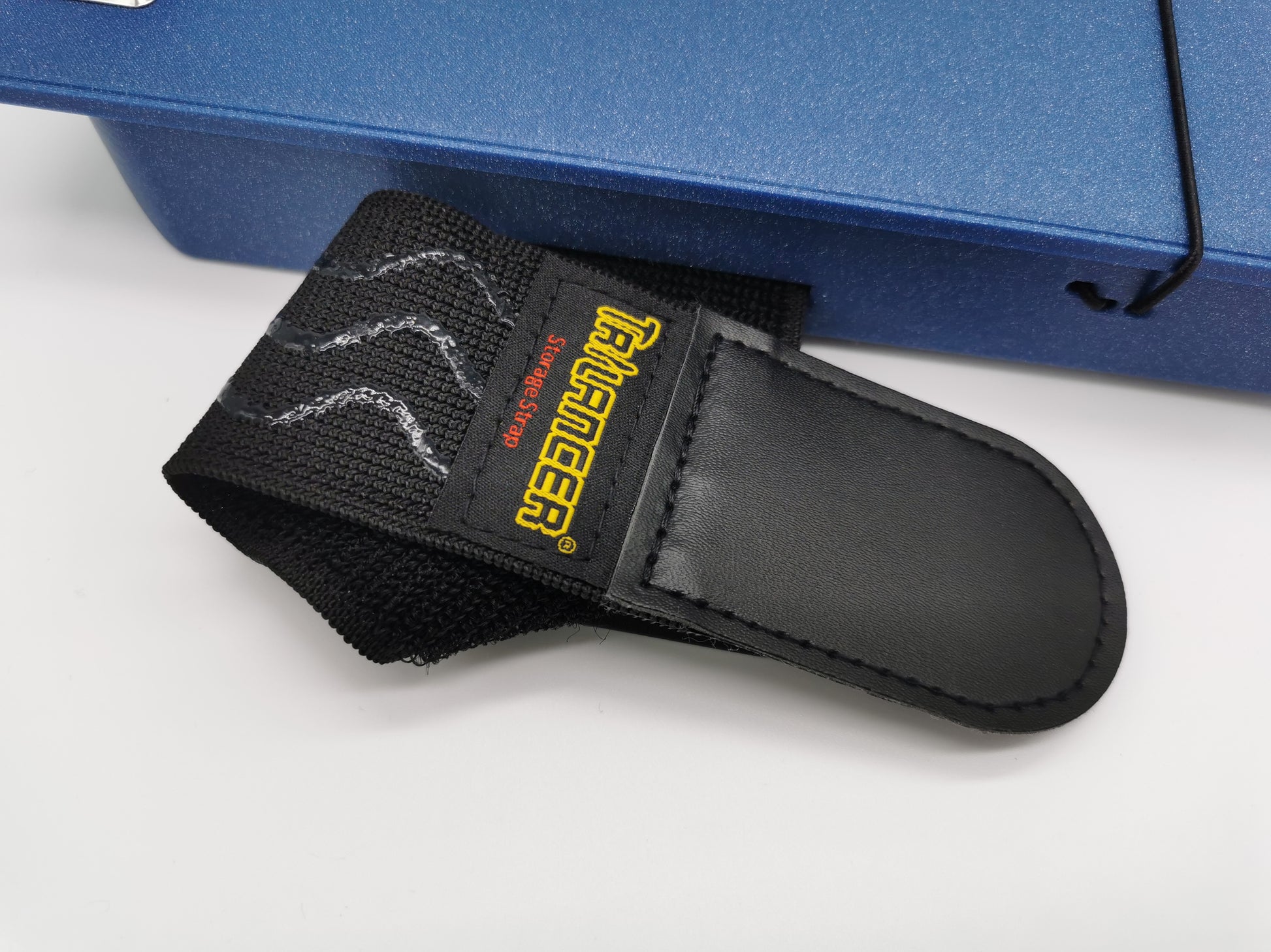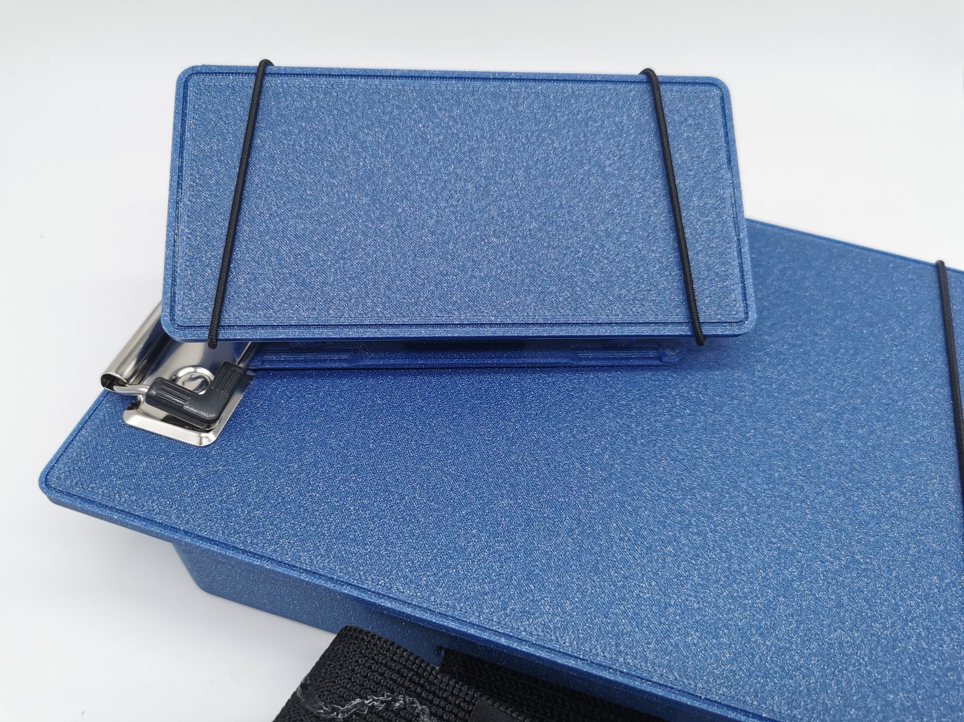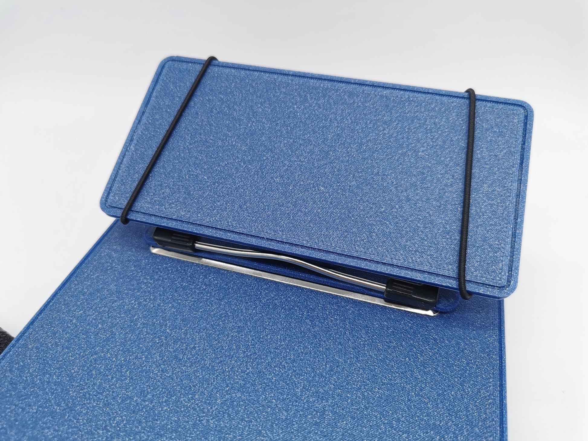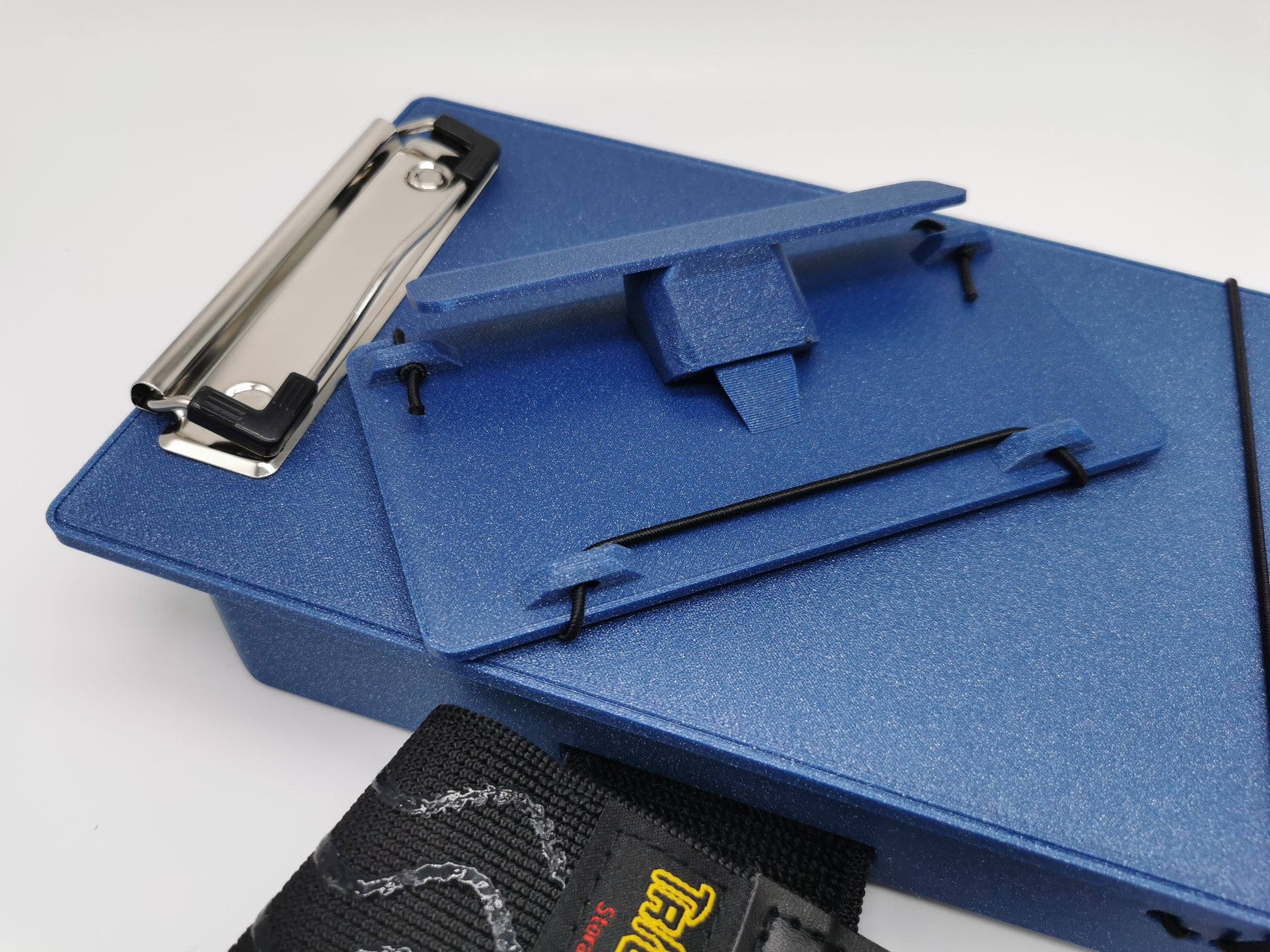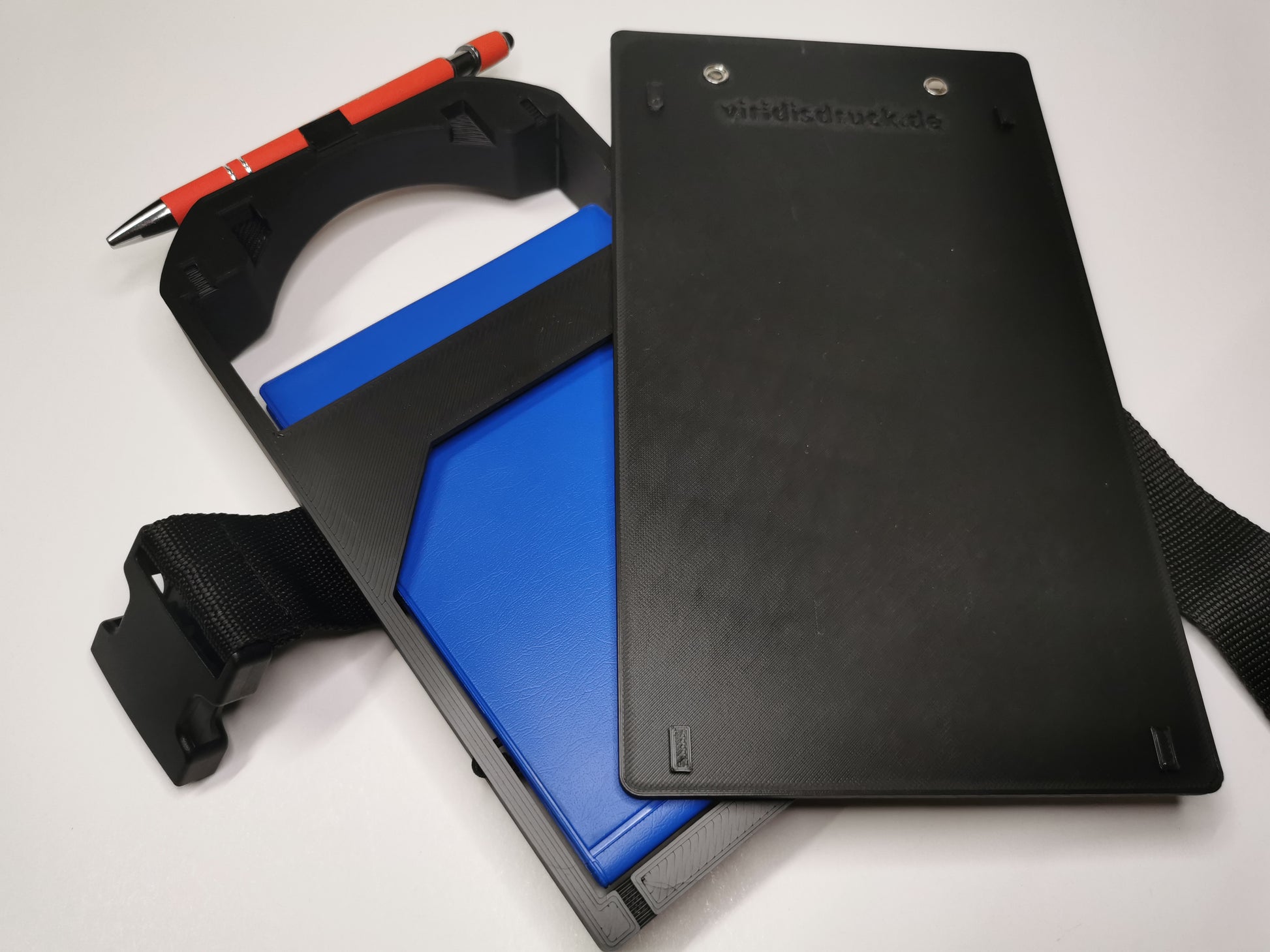 Die Stifthalter sind aus PETG gefertigt, das Befestigungsband besteht aus Synthesekautschuk und Nylon, die Klammer und Nieten aus Metall.