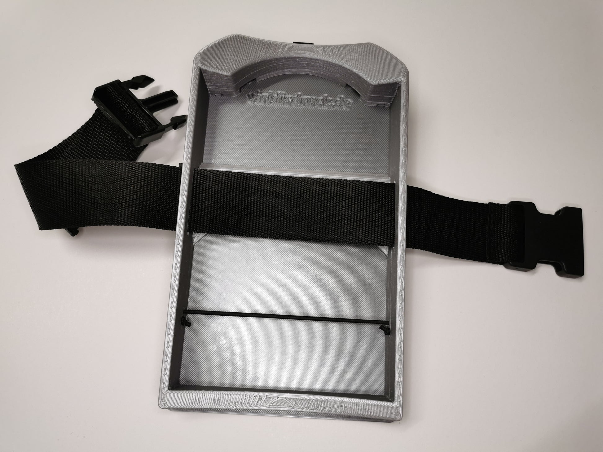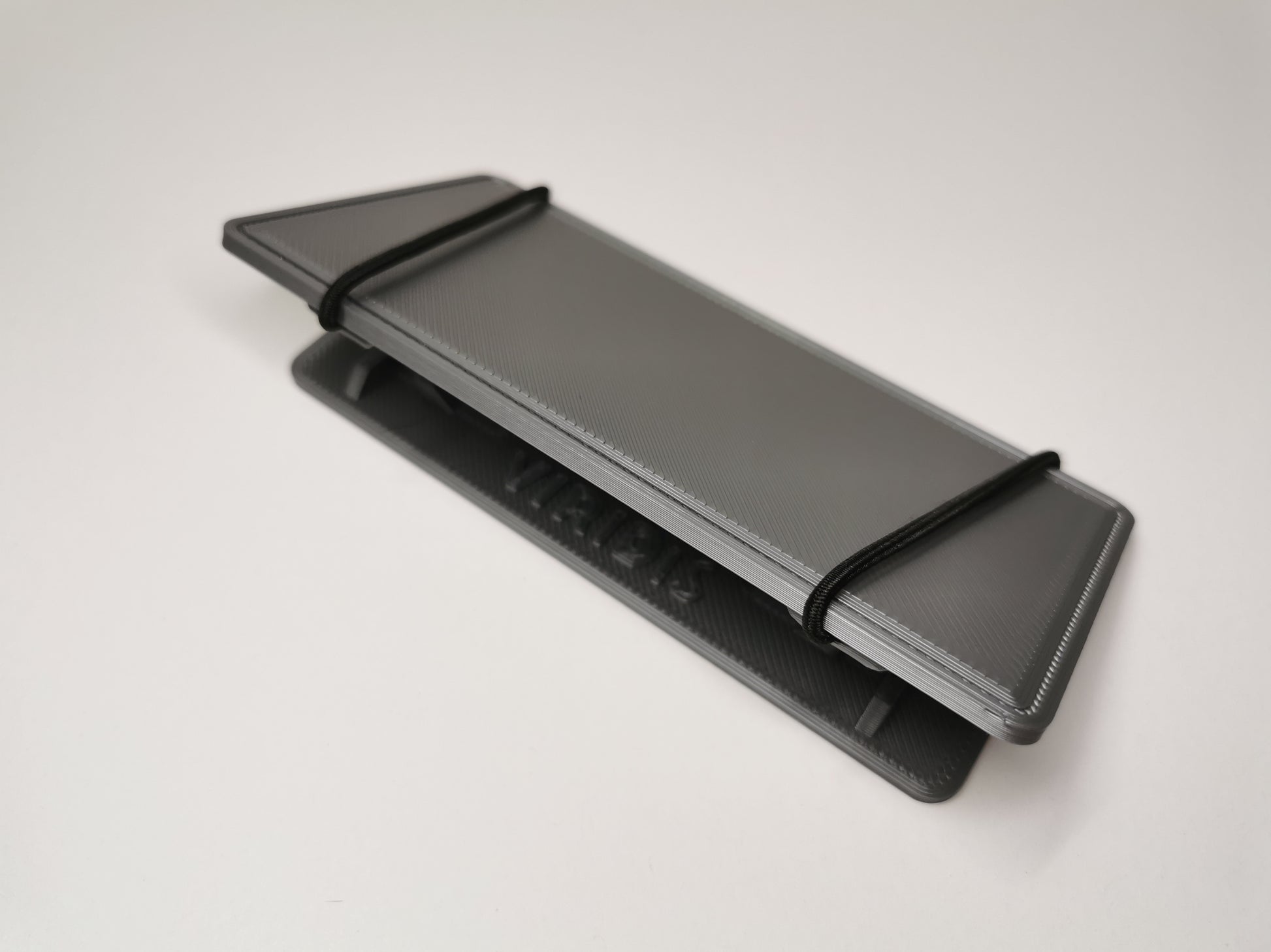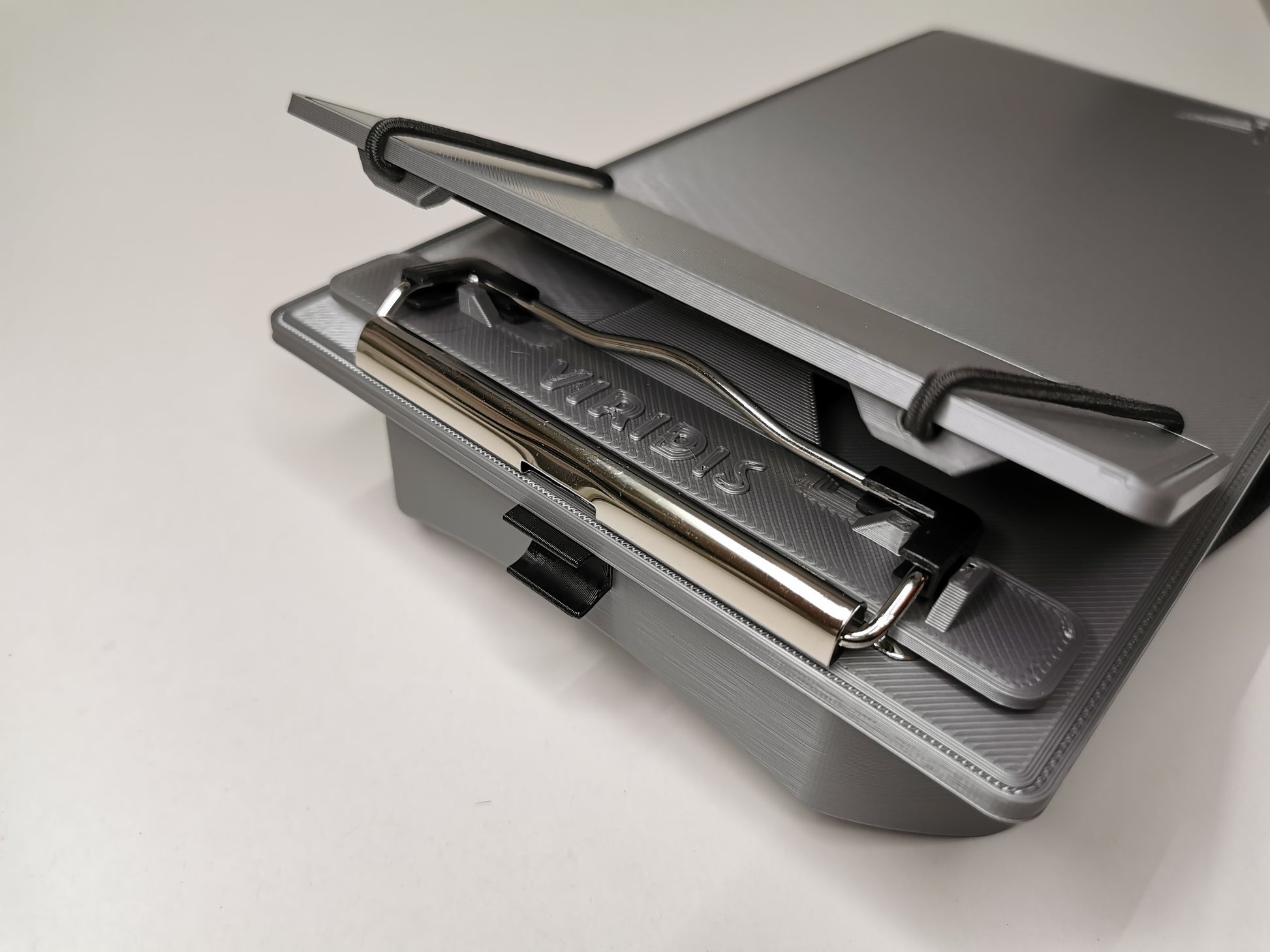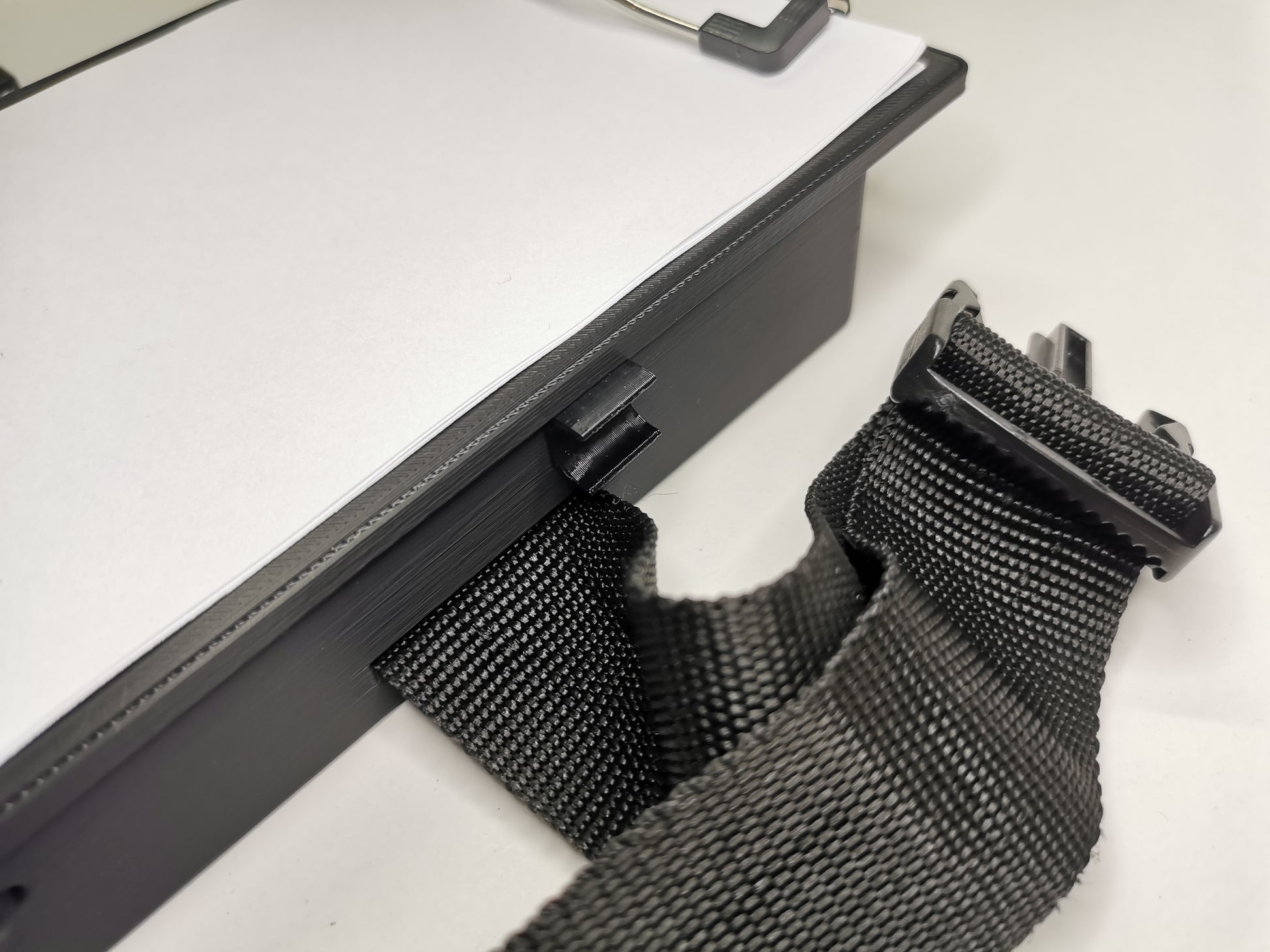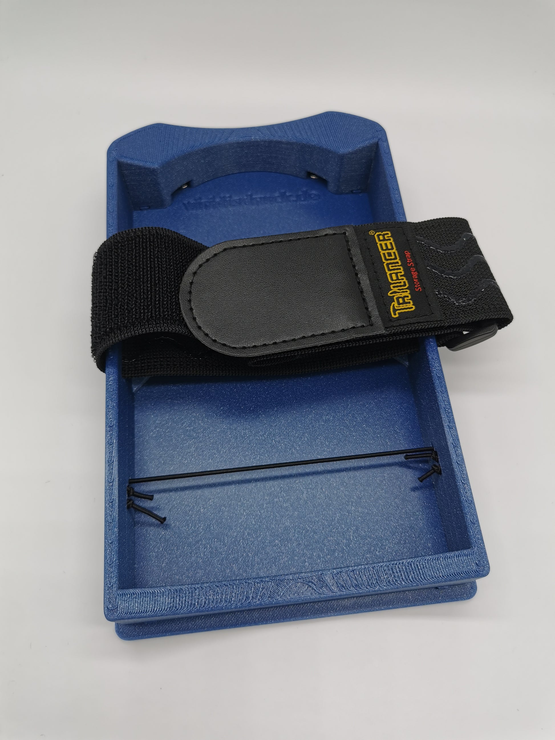 Die Stifthalter sind aus PETG gefertigt, das Befestigungsband besteht aus Synthesekautschuk und Nylon, die Klammer und Nieten aus Metall.