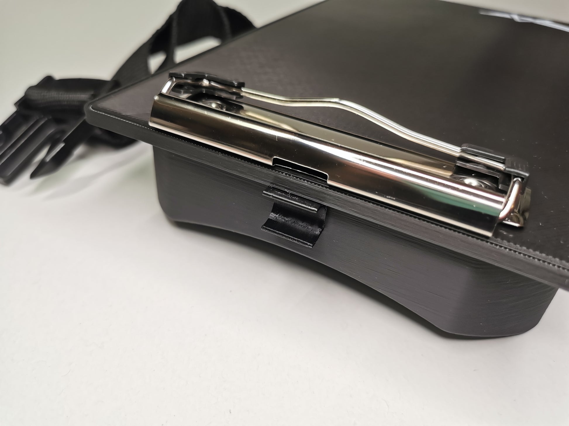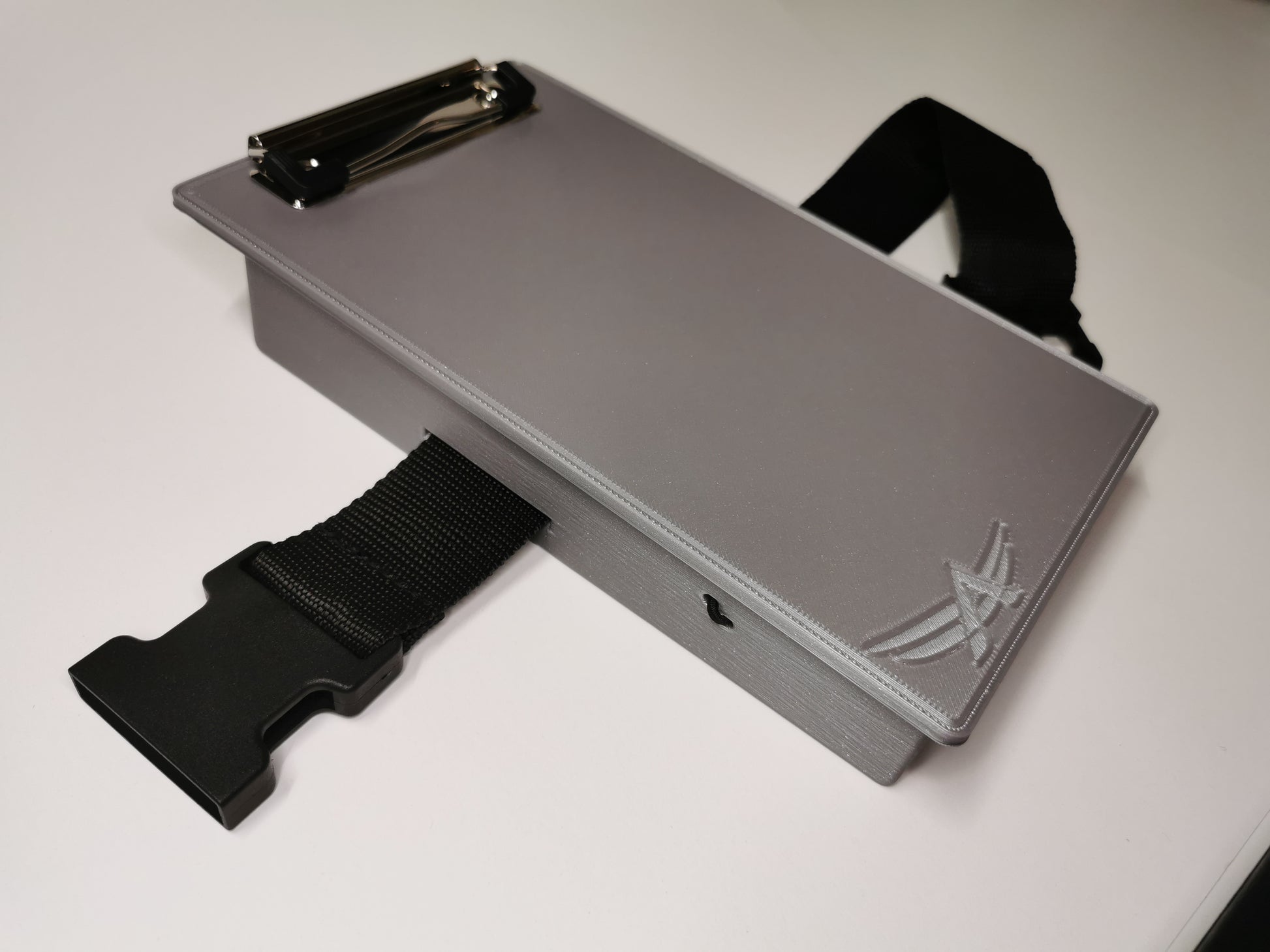 1 Piloten-Kniebrett mit Metallklammer, inklusive 4 Stifthaltern (2 Stück als Ersatzteil) und Befestigungsgurt mit Schnalle. Optional mit Handyhalterung. Kniebrett und Handyhalterung in Wunschfarbe.