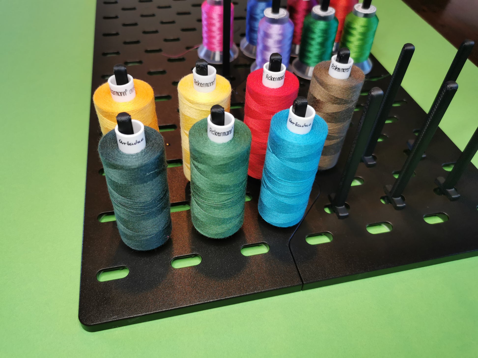 Diese Pins im praktischen 10er oder 18er-Set sind passend für die Ikea Uppdatera Lochplatten. Die Pins werden in die Öffnungen eingedreht und so lassen sich wunderbar all deine Garnrollen ordnen und rollen nicht mehr umher. Durch die Länge von 85mm kannst du bei kleinen Garnrollen noch 1-2 Unterspulenrollen mit aufstecken.