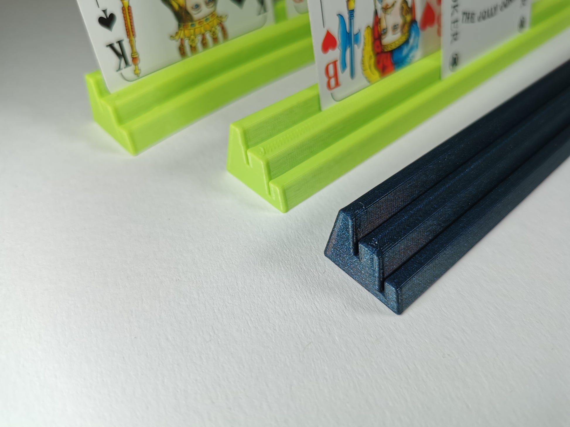 Die Karten werden in schrägen Schlitzen gehalten und können hintereinander auf zwei unterschiedlich hohen Ebenen eingesteckt werden. Die Seiten sind offen - so kannst du die Karten auch am Rand überstehen lassen, wenn du mal besonders viele Karten auf dem Halter platzieren musst.