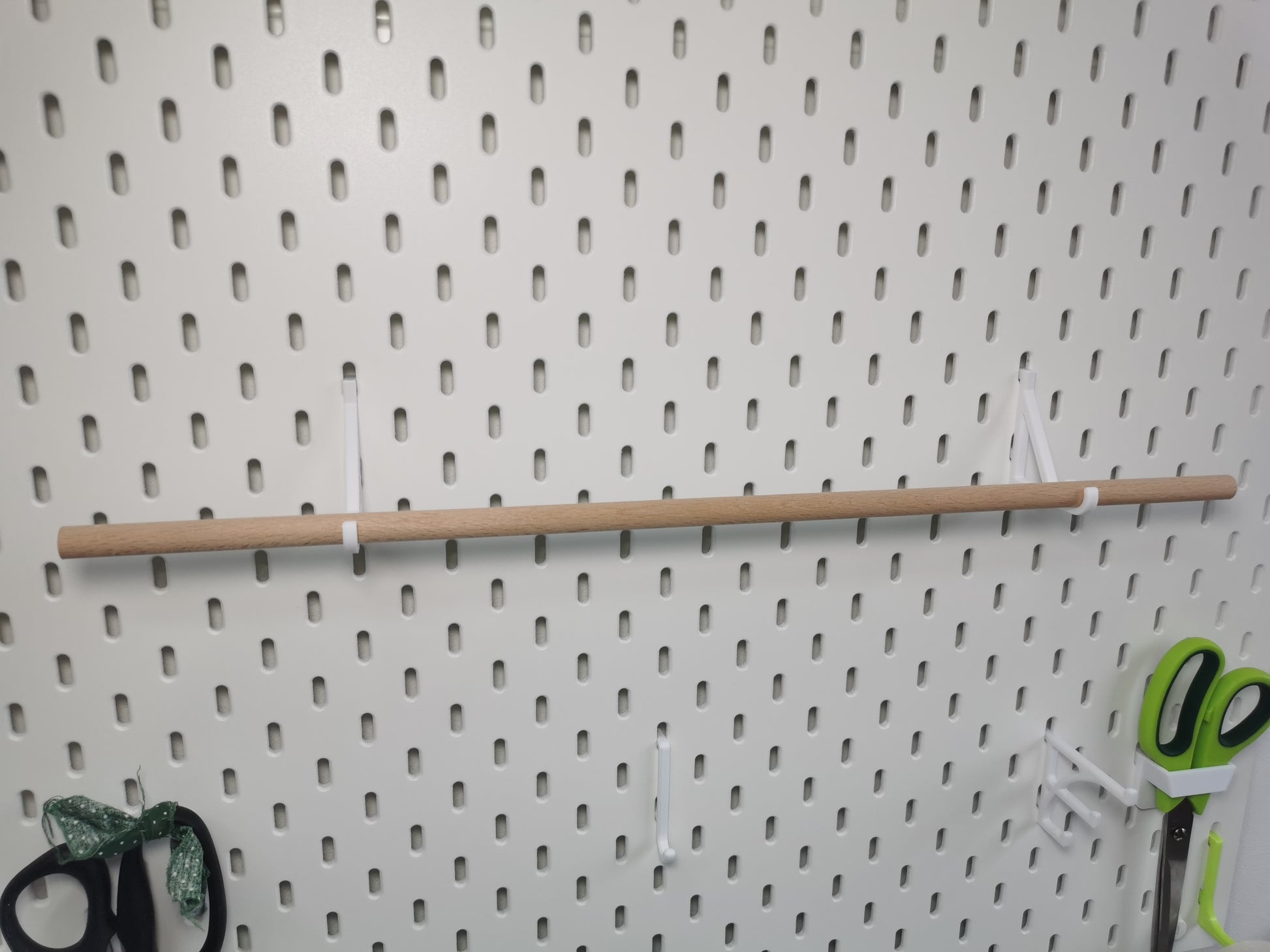 Damit du deine Skadis Lochplatte noch individueller gestalten kannst, haben wir diese Stangen-Halter entworfen. In die beiden Halter kannst du eine beliebig lange Stange (Holzrundstab oder Aluminiumrohr) mit einem Außendurchmesser von 12mm einhängen. So kannst du all deine Klebebänder, Washi-Tapes oder sonstige Rollen platzsparend und übersichtlich aufhängen.