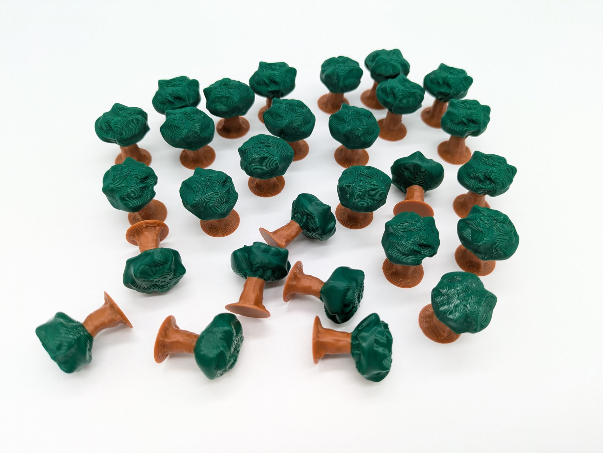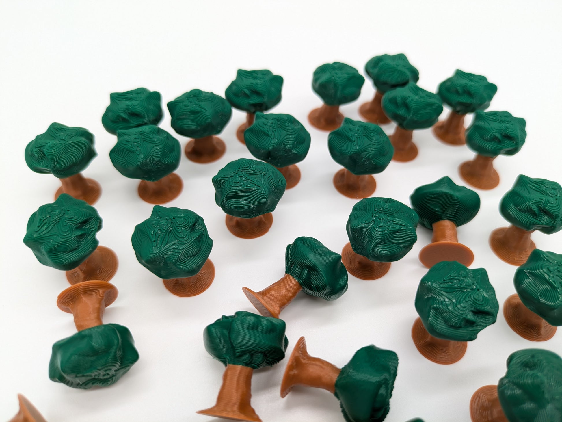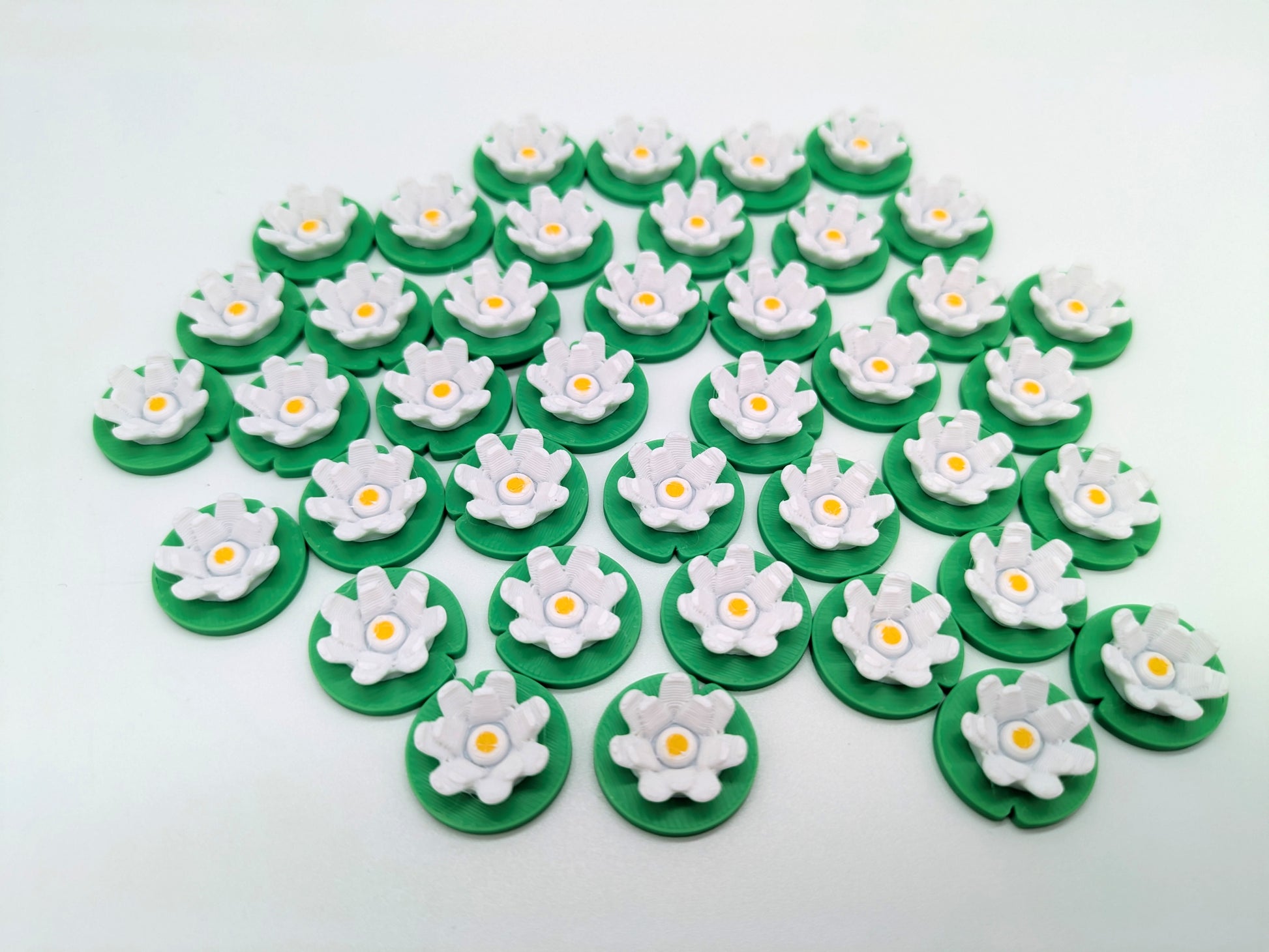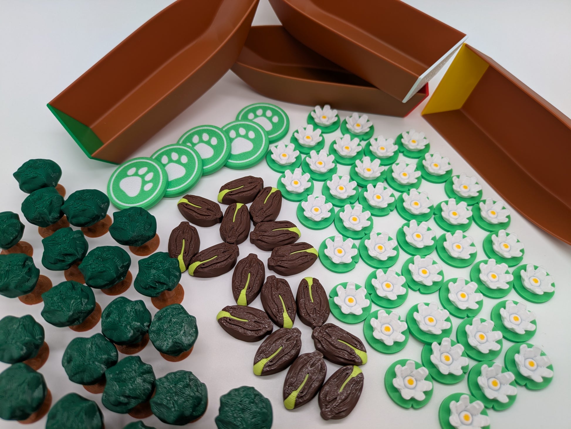 Baum-, Wasserpflanzen-, Samen-Token, Boote und/oder Pfotenmarker nach gewählter Ausführung.