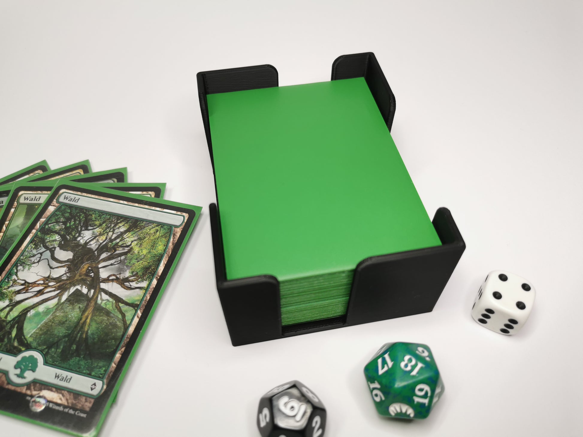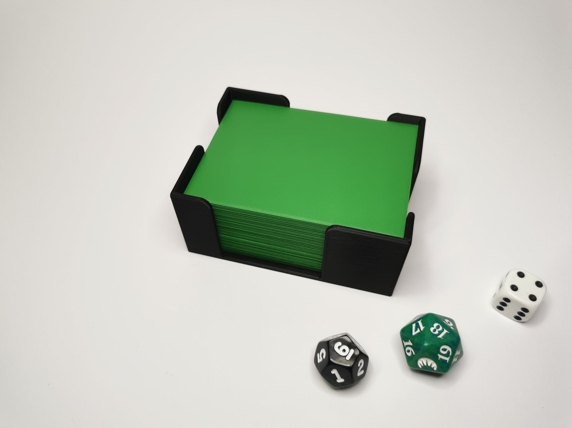 Gerade bei Karten in Hüllen passiert das schnell und ist ärgerlich. Damit dein Kartenstapel ordentlich auf einer Stelle bleibt, haben wir diesen Kartenhalter entworfen.