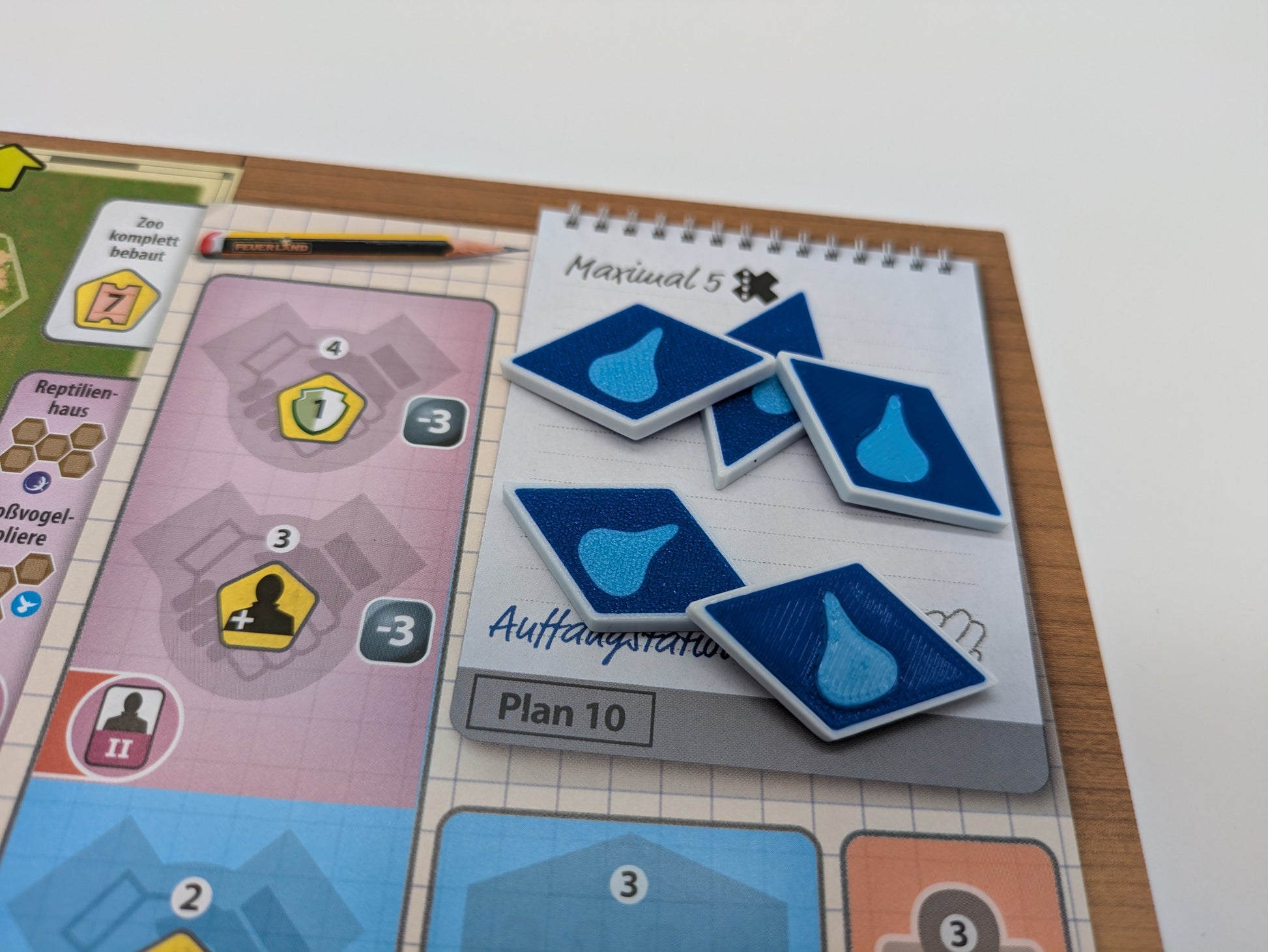 Im Spielverlauf geht leicht unter, dass man durch Aquarien, Sonderbauten oder bestimmte Karten bereits Wasserpunkte erhalten hat. Die praktischen Wasser-Token schaffen hier Abhilfe: Immer wenn du durch eine Karte oder ein Bauwerk Wasser erhältst, legst du einen Token in deinen Spielbereich und siehst sofort, wie viel Wasser sich in deinem Zoo befindet.