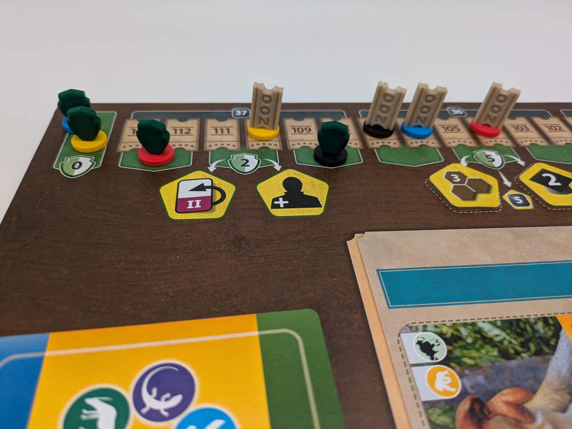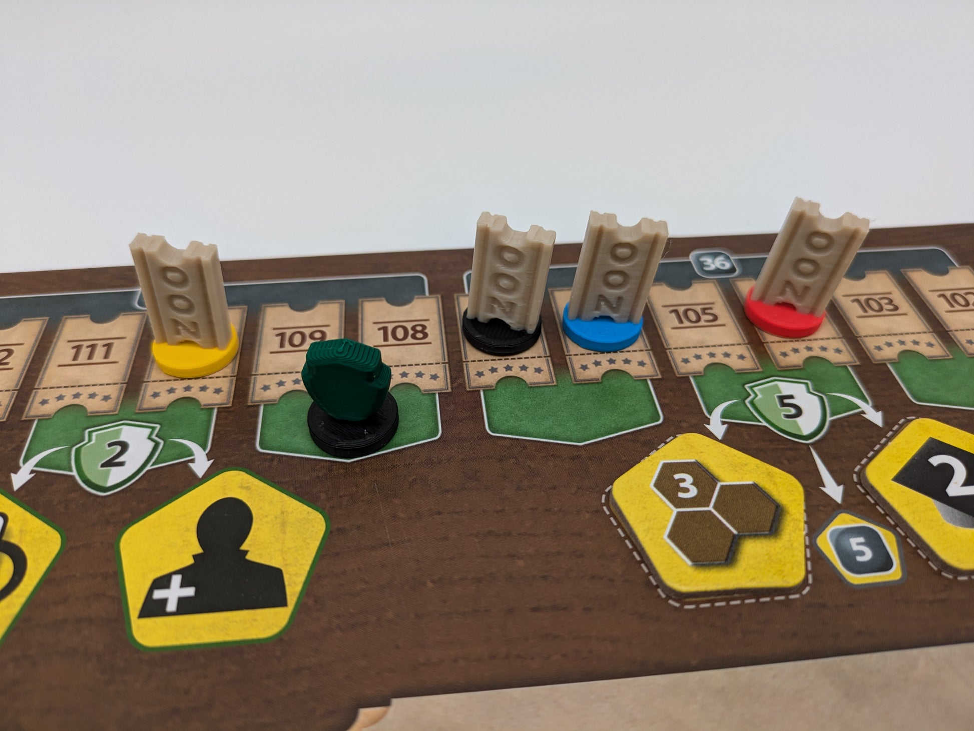 Diese Tickets, Wappen und Hüte ersetzen die originalen einheitlichen Zählsteine auf den Attraktions-, Artenschutz-und Rufleisten.